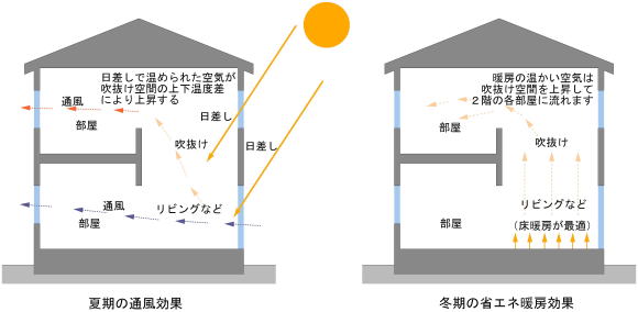夏期においては通風促進の場になり、冬期においては1階の床暖房の暖気が吹抜け部分を上昇していき、2階まで流れることで家全体の暖房費が抑制されるという考え方です。リビングに開放感を生むだけでなく、室内環境の向上にもつながります。
