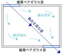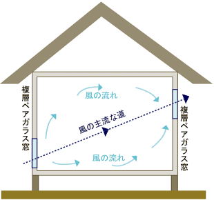 住宅の居室(居間・寝室・子供室・客間・食事室・キッチンなど)には、通風と換気効果を生み出すために、1つの部屋に2面開口をすることが大切です。2面開口には2タイプあって、平面的に部屋の2方向に窓を設けるタイプと、断面的に部屋の上下に窓を設けるタイプがあります。どちらのタイプも非常に効果がありますので、シックハウス・空気汚染に心配の方、クーラー病にお悩みの方、結露や細菌などによるアレルギー体質にお困りの方、などなど体に害のない健康住宅に住まわれたい方には、2面開口の手法は基本となる手法の1つです。